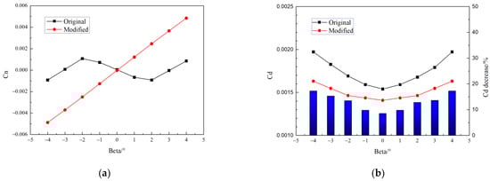 Coefficients of (a) yaw moment and (b) drag calculated with original (black) and modified (red) model.