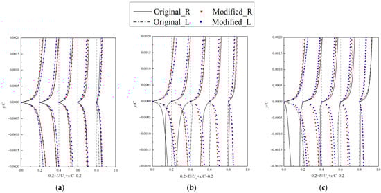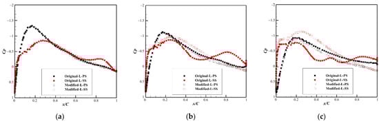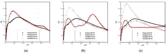 Cp distributions on the left vertical tail part of the original and modified models: β = (a) 0°, (b) 2°, and (c) 4°.