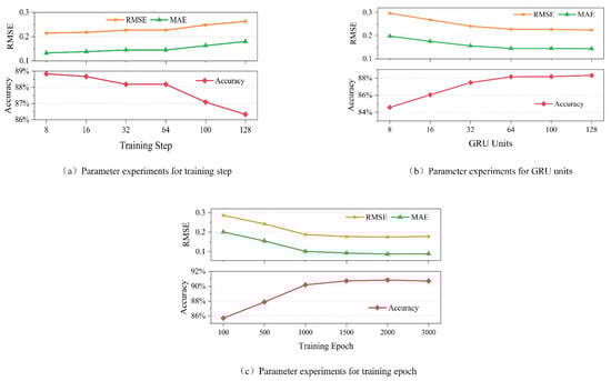 - The range of model training epochs was set to (500, 1000, 1500, 2000, 3000, 3500). The experimental effect of different training epochs was tested when the training step was 16 and the number of GRU units was 100, and the results are shown in Figure 7c. The experimental results revealed that the model training results tended to be stable when the number of model training rounds reached 3000; thus, the number of model training epochs was set to 3000.