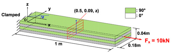 The next example is considered to illustrate the recovery analysis capability. A four-layered laminated composite beam employed in Liu and Yu [33] is considered for this purpose. Figure 2 shows the schematic of the beam with one end fixed and the other end subjected to a tip axial force (Fx = 10 kN). The beam is 1 m long with a width and height of 0.18 m and 0.04 m, respectively. The section consists of four layers having [90/0/90/0], which induces elastic coupling between extension and bending. The mechanical material properties are [33]: E1 = 110.5 GPa, E2 = E3 = 13.64 GPa, G12 = 3.92 GPa, G13 = G23 = 3.26 GPa, and ν12 = ν13 = 0.329.