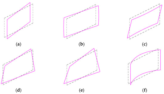 where is the (5 × 5) cross-sectional stiffness matrix that represents the beam in the Euler–Bernoulli–Vlasov level, and represents a coupling between and . The relationships between and the transverse shear forces on the cross-section are yet to be determined. The transverse shear forces affect , resulting in the variations of the shell stress resultants and generalized strains with respect to x. The relations are obtained under a pure shear condition [27]. When the higher-order terms () are neglected, the differentiation of Equation (26) by x gives