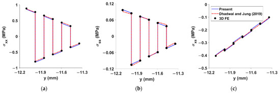 Comparison of the layer-wise stress distributions at the left wall between the present, Dhadwal and Jung (2019) [36] and 3D FE: (a) axial stress; (b) hoop stress; (c) tangential stress.