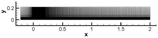 T3A flat transition plate case is used here for data calibration. The mesh is shown in Figure 2, which has 325 cells in x-direction and 108 cells in y-direction. Mesh adjacent to the wall or at the leading edge of the plate has been refined. As the results show in Figure 3, a value too large will lead to a predicted transition position much earlier than that of the physical truth; thus, for calibration was ultimately set as . To control the friction coefficient of a turbulent area, the correction factor of the destruction term was set as 1.0.