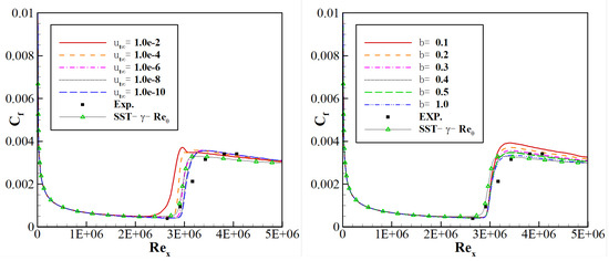 Dhawan and Narasimha [8] proposed an algebraic intermittency form with the method of fitting. Similarly, Klebanoff et al. [9] postulated another empirical formula aimed at solving flat plate turbulence problems. However, the results of these two models in complex flows are not that reliable as vortex structures are not considered in such empirical solutions. Libby [10] first applied intermittency-involved transport equation to perform computations on turbulence, and Dopazo [11] worked on the perfection of this idea. Then, it was followed by research focused on improving predictions based on an intermittency model for the number of flows. Among them, the model presented by Cho and Chung [12] is most representative, and can simulate the distribution of planar jet, circular jet, planar mixed layer and wake. Steerlant and Dick [13] put forward a transport equation for , but the results of it are not that good in a normal direction. Huang and Suzen [14] construct a function combining the two models mentioned above. These models, however, cannot be used in parallel computing as a single boundary layer cannot be calculated with different kernel processors. Moreover, momentum-thickness is hard to obtain when using non-structural meshes. To solve these problems, Menter et al. [15,16] replaced Re based on momentum-thickness by based on local strain rate, and developed the four-equation transitional SST model, which can also be called the SST-- model. The conservative four-equation SST transition model based on non-dimensional and can be written as:
