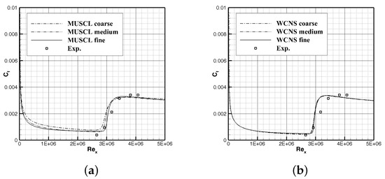 A still transition plate case is used for the mesh-dependency study. Three sets of T3A plate meshes are used here, specifically, , , and (flow direction × normal direction) as coarse mesh, medium mesh and fine mesh. The mesh number of the coarse mesh is 2/3 of that of the medium mesh in both directions, while the mesh number of the medium mesh is 2/3 of the fine mesh on both directions. Figure 4 shows the results calculated by machine-learning-coupled CFD, respectively, based on a second order MUSCL scheme and five order WCNS scheme of different sets of meshes. The of different sets of meshes is in better accordance with each other than that of MUSCL scheme, and agrees with the experiments well. This implies that the high-order WCNS scheme has lower numerical diffusion, thus, better dependency. In addition, the credibility of the machine-learning-coupled CFD frame is verified.