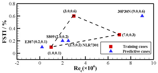 The mesh used for calculation is depicted in Figure 8, which is a C-type mesh with a height of the first layer of and has 67,734 grid cells in total. Calculation results from SST-- under the WCNS scheme are used as the true value of the training process. The training data is taken from three S809 airfoil solutions with different Reynolds numbers and turbulence intensities, and each of them are set with five different angles of attack, respectively, 0°, 2°, 4°, 6° and 8°. All training cases are shown in Figure 9 as the red points, respectively, are (, 0.1), (, 0.6) and (, 0.3) (Reynolds number, of the far field).