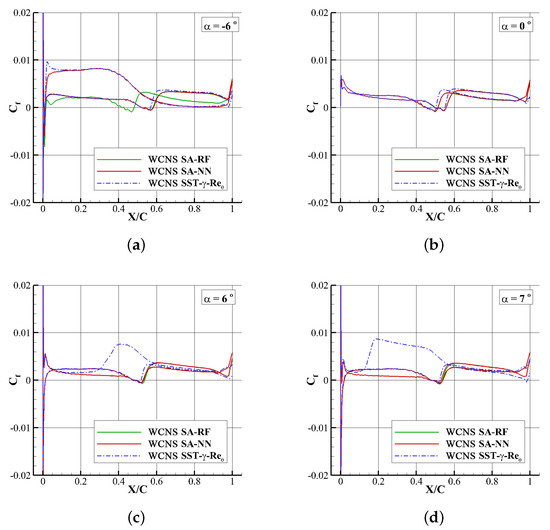 A comparison of the predicted fractional coefficient of the airfoil and the experimental values is plotted in Figure 19. As expected, results of all of the three models almost overlap with the experiment. The transition phenomena of the leading edge of the slat, the main wing and the trailing edge of the flap can be captured by all of the three models, among which the transition situation of the slat is predicted to be the same for the three models, and that of the main wing is predicted to be slightly different from the experiment by machine-learning models. For the flap at the trailing edge of the airfoil, the SA-RF model and SST-- model have the same results as the experiment, while the SA-NN model predicts it earlier.
