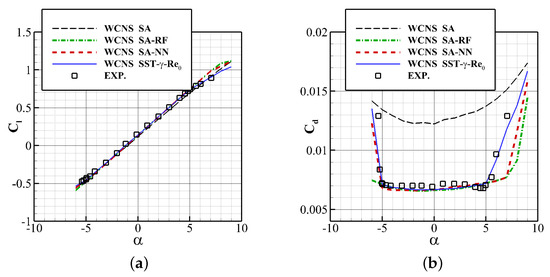 A comparison between the lift coefficient and the drag coefficient predicted by two data-driven transition models, the SST-- model and experiments is depicted in Figure 12. It is significant that the SST-- model fits well with the experiments, and the SA-NN and SA-RF model also predicts it quite well under small angles of attack. However, due to the situation predicted differing, the lift coefficient predicted by two data-driven models are a bit higher, while the drag coefficient is lower.