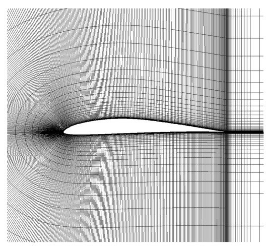 The mesh used for calculation is the same as the training case and is shown in Figure 8. The Reynolds number of the initial flow is set to be , while the turbulent viscosity of the leading edge of the airfoil is set to be , different to the training set and an extrapolation generation. The angles of attack range from −6° to 9°, including interpolation and extrapolation generation.