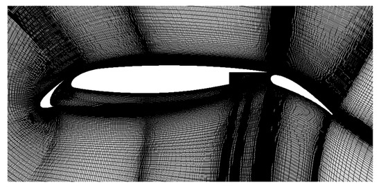 NLR 7301 high-lift airfoil is a classical low-velocity turbulence CFD test case [37], a main wing and a flap concluded. The flap angle is , and the lap area is 5.3, a seam width of c constructed. The experiments of the airfoil are conducted in an NLR 3 m × 2 m low-speed wind tunnel [38]. It is found that a laminar separation bubble is produced on the leading edge of the main wing. The test settings of the initial flow are kept the same as the experiments, including a Mach number of 0.185, Reynolds number of , and FSTI . The mesh for calculation is shown in Figure 16. The height of the first layer mesh is approximately c. The far-field border is 150 c to decrease the disturbance of the far-field border to the flow field near the surface of the airfoil, mesh cells were chosen. This test case mainly focused on the extrapolation generalization ability of the geometric outline of the machine-learning models.