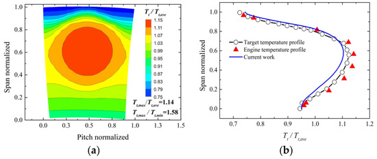 The inlet total temperature profiles were set according to the work by Povey et al. [26], as shown in Figure 3. Figure 3a shows the total temperature contour at the inlet. The ratio between the maximum Tt and mean Tt is 1.14 and the ratio between the maximum Tt and minimal Tt is 1.58, both of which are slightly less than these in realistic aero-engine (the former is 1.21 and the latter is 1.64 [26]). Figure 3b presents the circumferential averaged total temperature distributions used in the current work and two total temperature profiles from the Ref. [26]. The hot streak center is at 60% span, which is consistent with one at realistic combustor exit.