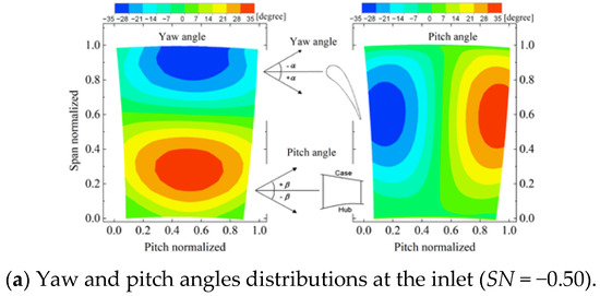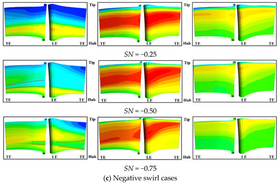 The combined influences of swirl and the changes in the inlet incidence angle due to the swirl are responsible for the flow patterns above. For the incidence angle effect, positive swirl inflow with anticlockwise tangential momentum generates the positive and negative incidence angles at shroud and hub individually, as revealed in Figure 12. The positive incidence angle shifts the stagnation points at shroud toward PS and generate high static pressure, induces flow to aggressively accelerate toward SS and therefore results in the lower static pressure, as shown in Figure 13. Analogously, the negative incidence angle at hub shifts stagnation points toward SS and regions with high static pressure form, causes acceleration toward PS and therefore leads to the lower static pressure. The incidence angles increase monotonically with spanwise, thus resulting in a spanwise pressure gradient, i.e., pressure gradient from shroud to hub along PS and the exactly opposite pressure gradient along SS. The spanwise pressure gradients have the same orientation with swirl within the passage consisting of NGV1 SS and NGV3 PS, which enhances the upwash/downwash flow on NGV1 SS/NGV3 PS, as presented in Figure 13. Meanwhile, around NGV2, spanwise pressure gradients are opposite to the swirl and have more remarkable impacts on the flow. Thus, it is the spanwise pressure gradients that induce the streamlines on the surfaces toward endwall. However, the incidence angle effect has comparatively slight impacts on static pressure distributions on NGV1 PS and NGV3 SS. Hence, the streamlines on NGV1 PS are dictated by swirl flow and thus show upwash characteristics, and those on NGV3 SS are similar to that of the no-swirl case. Nearly opposite streamlines distributions are observed for the negative swirl case (SN = −0.50) and the analogous reasoning can be applied.