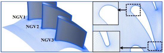 The realistic clocking position of NGV relative to the inlet non-uniform profiles was considered in the current investigation. There exist 30 fuel injectors in the combustor and 46 HP NGVs in GE-E3 engine, and thus the count ratio between HS or swirl and NGV is 30:46 which is close to 2:3. To reduce calculated cost and minimize the effect caused by domain scaling, the number of NGVs in full scale was amplified by the factors of 46/45, i.e., the two hot streaks and swirl profiles for every three NGVs. Thus, the computational domain consists of three NGVs. Simultaneously, the other parts of GE-E3 HP turbine were also modelled to provide back pressure for the NGV, but with coarse grids, as revealed in Figure 1. The simulation boundary conditions were specified according to the GE-E3 turbine performance test report [25]. The rotational period boundary condition was specified for domain of every blade-row. The inlet was assigned with the swirl and HS (mass-flow averaged total temperature is 709 K). The inlet turbulence level is 10% with the eddy viscosity ratio of 100, static pressure at outlet was 62 kPa and the angular velocity for rotor blade-row was 8349 rev/min−1. Nonslip boundary conditions were specified for the solid wall. Adiabatic wall and isothermal wall with temperature of 0.7 times inlet-averaged total temperature (496.3 K) were set for different cases to obtain heat transfer distribution.