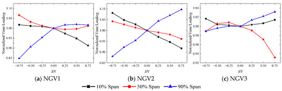 Variations in the pressure distribution on NGV must lead to the change in blade loading. A lumped parameter, Zweifel coefficient [41], was introduced to represent blade loading under different swirl intensities. In the current work, Zweifel coefficients of swirl cases are normalized by that of the no-swirl case and named it loading coefficient. NGV loadings under variable swirl intensifies are indicated by Figure 15. As expected, loading coefficients at 10% and 90% spans of NGV2 increases and declines with the SN respectively, resulting from the fact that the enhanced SN increases the incidence angle at tip and decreases incidence angle at hub. The relative change in blade loading is about 9% at lower span and 10% at upper span, which is mainly due to the core of swirl locating at 60% span. For the same reason, the loading coefficients at 50% span present the same trend with that at 10%.