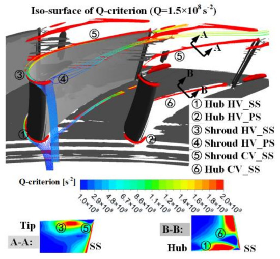 In this section, the flows at endwall under different swirl intensities are presented, which features the evolutions of horseshoe vortex and passage vortex. Figure 16 presents an iso-surface of the Q-criterion inside the vane passages for the no-swirl case. After impinging the leading edge, one horseshoe vortex (HV) is divided into two parts which are suction side leg of horseshoe vortex (HV_SS) and pressure side leg of horseshoe vortex (HV_PS). These vortexes appear at hub and shroud regions simultaneously. The HV_PS migrates toward the suction side of the adjacent vane but does not interact with HV_SS to form passage vortex, which is different from the classic secondary flow structure described by textbook. It is stretched along transverse direction while passing downstream, which leads to the decrease in vorticity (showing agreement with Helmholtz vortex law for vorticity conservation [42]). Thus, the iso-surface is observed to disappear at the furthest part of pressure side. Then, it interacts with the adjacent HV_PS and wake vortex downstream of the trailing edge.