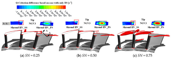 Compared to the no-swirl case, distinctive secondary flow structures are observed at the swirl cases, as illustrated by the Figure 17 which includes vorticity difference contours in the cross section of Z/Bx = 50% relative to the no-swirl case. The notable changes in vortex system are observed near shroud. With positive swirl, the HV_PS and HV_SS of NGV3 are both enhanced by the swirl, and their intensities increase with the swirl intensities. While horseshoe vortex of NGV1 and NGV2 is weakened near leading edge and then reinforced at downstream of suction side. The iso-surfaces for horseshoe vortexes of NGV1 and NGV2 are thus found to disappear near leading edge due to the lower vorticity, and then arise at the downstream of suction sides. Note that HV_SS values of all NGVs are intensified at the downstream when compared to the no-swirl case; for brevity, only the vorticity contours of NGV3 are shown hereby, which has the most significant change in vorticity. Furthermore, additional vortex structures appear near the upper span of NGV1 SS and NGV2 SS at SN = 0.75. These are generated by the interaction of swirls. The flow has the opposite tangential velocities at the boundary between two adjacent swirls and thus a new vortex is generated at triangle area near shroud, as shown in Figure 10 (red triangle dashed box). Then, the new vortexes are convected downstream, enhanced as the flow accelerates along suction side, and transported toward upper span by the upwash flow. It should be stated that the similar vortex structures also arise at the lower span, but with much smaller strength (one small core of this new vortex can be seen near the lower span of NGV2 SS), originating from the triangle area near hub. With negative swirl, a reinforced HV_SS and a diminished HV_PS are observed near NGV1. The intensity of the former increases with |SN|, while the intensity of the latter declines with it and finally disappear at SN = −0.75. Moreover, a newly formed vortex is seen near the midspan of NGV1 SS and NGV2 SS respectively (with extremely small-scale vortex core). This is resulting from the similar mechanisms to those in the positive swirl case.