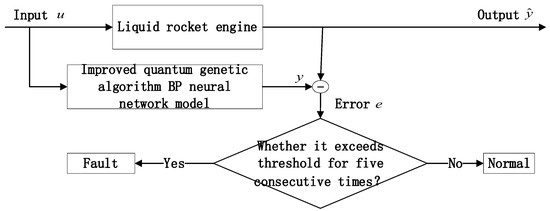 The process of optimizing the BP neural network based on QGA is shown in Figure 2. The basic train of thought when using a QGA to optimize the BP neural network based on an LRE real-time fault detection method (hereafter called QGA-BP) and an LRE based on an AGA-BP real-time fault detection method is almost the same: first of all, gather LRE-based real-time sensor data and establish the model of the fault detection assessment model to calculate the output state of the system. Then, the output of the detection model is compared with the actual sensor output value to obtain the residual value, which is used as the basis for the current state of the engine system. The fault detection method based on QGA-BP is shown in Figure 3.