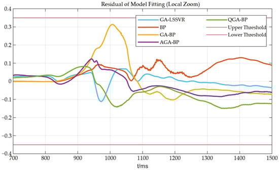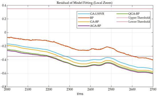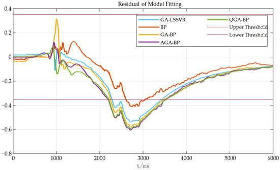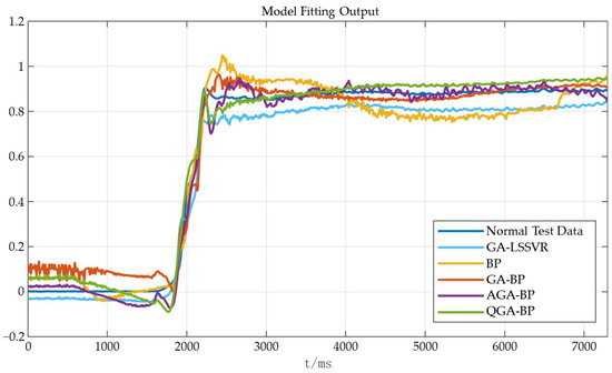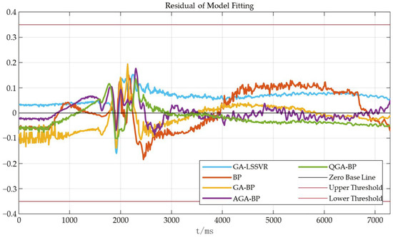 The BP, GA-BP, AGA-BP, QGA-BP and GA-LSSVR fault detection models were compared with the normal test data of the rocket engine. Figure 6 shows the fitting output of the BP, GA-BP, AGA-BP, QGA-BP, and GA-LSSVR models for normal test run data of this type of hydrogen and oxygen rocket engine, and Figure 7 shows the corresponding residual graph.