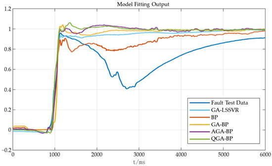 Figure 8 and Figure 9 show the fitting output of BP, GA-BP, AGA-BP, QGA-BP, and GA-LSSVR models and the corresponding residual maps under fault test data of this type of engine. It can be seen from the figure that these five fault detection models could effectively detect faults when identifying the fault data of this type of engine under the threshold of 0.35.