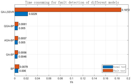 In the current computing environment, it was checked under the two test tracks whether it was the detection of normal test data or fault test data (in which 730 data points were collected for normal test data and 6001 data points were collected for faulty test data). The total fault detection time of BP, GA-BP, AGA-BP and QGA-BP models was in the order of milliseconds. The fault detection time of the GA-LSSVR model was longer than that of other models, but it also met the requirements of real-time fault detection and the control cycle of this type of engine. Figure 10 compares the detection time of the five fault detection models.