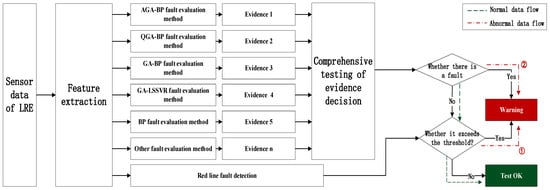 The specific method is as follows: Firstly, liquid rocket engine sensor data are extracted, and feature processing is carried out and then divided into two directions. The red line threshold fault detection method is taken as the fault detection method, that is, once the fault is detected by the red line threshold detection method, no matter whether the fault is detected by other fault detection methods, it is regarded as an engine fault at the current time, and the system will issue an early warning (see dotted line 1 in Figure 13). For other fault detection methods, such as the AGA-BP, QGA-BP, and GA-LSSVR fault detection methods proposed in the previous section, the corresponding evidence body is obtained by detecting the engine state at the same time, and then the comprehensive fault detection principle is chosen according to the evidence (such as the minority is subordinate to the majority, or if more than two methods think that the current system failure is an alarm) for fault detection (see dotted line 2 in Figure 13). For a fault detection system to think that the engine works normally, it is necessary to meet the condition that the joint detection of multiple fault detection methods does not meet the evidence decision comprehensive fault detection principle, and red line threshold fault detection does not exceed the red line threshold at the same time.