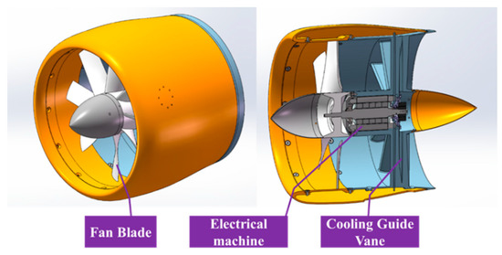 Today, the EDF is widely used in several flying vehicles due to its high propulsion efficiency, high safety, and low noise during operation. In the EDF, the fan blades are driven by an electrical machine and compress the air to provide the thrust force. Similar to the turbofan engine, the hub-to-tip ratio of the EDF influences the propulsion efficiency by affecting the aerodynamic performance of the ducted fan [23]. In order to maintain a high propulsion efficiency, the hub-to-tip ratio should be selected to be as small as possible. However, in a direct hub-driven fan, the hub-to-tip ratio constrains the diameter of the electrical machine, which is a critical parameter for torque generation in the electromagnetic aspect and also the heat dissipation aera in the thermal management aspect. Therefore, the power density of the electrical machine is diminished when a small hub ratio is chosen during the aerodynamic design of the ducted fan. Efficient thermal management technology may provide one of the effective means of improving the power density of the electrical machine.