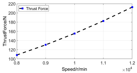 To validate the thermal benefits of the proposed CGVHP for electrical machines, an EDF, based on a prototype eVTOL, was used as a case study. The weight of the prototype eVTOL was 100 kg, and 6 EDFs with the proposed CGVHP were used to provide the required thrust for the vertical take-off process. Taking the safety margin into consideration, the thrust force of each EDF was 220 N. Table 1 lists the corresponding EDF specifications. The EDF, with the ducted fan, electrical machine, and cooling guide vane, is shown in Figure 3. An aerodynamic analysis using ANSYS-CFX was carried out to obtain the thrust force and fan rotor torque. The corresponding thrust force and torque, with the fan speed, are shown in Figure 3 and Figure 4. This data sheet provided the input for the later thermal designs of the proposed CGVHP.