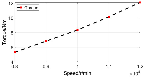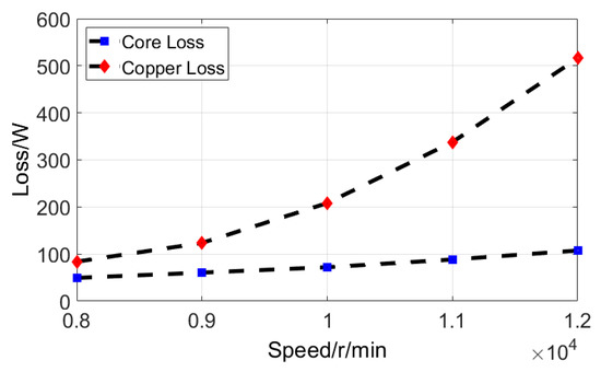 As a result, the calculated core loss and copper loss of the whole stator, with the fan speed, are shown in Figure 12. With the speed increasing from 8000 to 12,000 r/min, the core loss of the stator increases from 49.4 W to 107.4 W. Meanwhile, the rotor torque of the EDF grows proportionally with the increasing speed, and the resulting copper loss increases rapidly from 83.93 W to 516 W, with a growth of nearly 6.15 times. The sharply increased copper loss entails significant requirements for the thermal management of the stator winding.