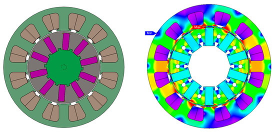 The CGVHP enables a higher power density of the electric machine to be obtained because it is in direct thermal contact with the end windings. Therefore, a lower thermal resistance and a higher continuous current density are enabled. The goal of the electrical machine design is to achieve a continuous output power density of 8.9 kW/kg (active mass only) under forced air cooling conditions. A high-power-density electrical machine is designed, for reference, as a 10-pole, 12-slot radial flux machine with double layer winding, and a spoke-type rotor configuration is selected [25]. The cross section view and magnetic flux distribution of the electrical machine under no-load condition is shown in Figure 5. The heat pipe is inserted into the end windings between two coils. The machine’s basic specification parameters are presented in Table 2. The chosen electrical machine design has the following beneficial features: