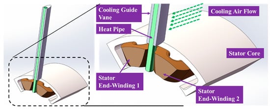 The cooling mechanism of the proposed CGVHP can be described as shown in Figure 2. In this design of the proposed CGVHP, the heat pipe was selected to transmit the heat from the copper loss in the stator windings to the cooling guide vane due to its high heat flux capacity [24]. Therefore, an additional heat dissipation path for the stator winding was established between the stator end windings and cooling air flow through the proposed CGVHP. The temperature of the stator end windings is reduced, and the continuous output power of electrical machine is improved, as is the power density of the electrical machine.