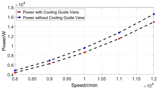Similar to the turbofan engine, the cooling guide vane is the stationary blade which transfers the kinetic energy from the swirling flow into pressure. Therefore, the aerodynamic design of the cooling guide vane should be carefully considered. In the proposed design, the cooling guide vane provides not only the aerodynamic function of the ducted fan, but it is also the heat dissipation part of the electrical machine in the EDF. Consequently, in the design of the cooling guide vane, there is a coupling effect between the thermal performance and aerodynamic performance. Since this paper is primarily focused on evaluating the improvement of the thermal performance of the proposed CGVHP in the EDF, a detailed aerodynamic analysis of the cooling guide vane is considered beyond its scope. However, by comparing the EDF’s performance with and without the cooling guide vane, we can see that the CFD results show that the cooling guide vane can be helpful in reducing the power consumption of he ducted fan while maintaining the thrust force at the same level. A comparison of the power consumption and thrust force of the EDF with and without the cooling guide vane is shown in Figure 7. It shows that with the help of the cooling guide vane, the power consumption of the fan decreases from 16.595 kW to 14.95 kW at 12,000 r/min, so that the fan saves 1.645 kW and, consequently, the fan propulsion efficiency is improved.