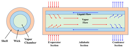 Among these materials, the heat pipe is an efficient type of heat transfer device that has been adopted in the design of electrical machines in some studies and inventions [26,27]. The thermal conductivity of heat pipes can reach 104 W/mK, far exceeding that of the common thermal conductive materials. Therefore, the heat pipe is selected according to the material. Figure 8 shows the working principle of the heat pipe [28]. A heat pipe is a tube filled by a working fluid in a saturated state, which mainly includes three parts, namely, an evaporator section, adiabatic section, and condenser section. When the evaporator section is heated up, vapor is generated and carries the heat to the condenser section, where the heat pipe is cooled through the convection process. Then, the working fluid turns from a vaporous state back to a fluid state and flows back to the evaporator section, driven by the capillary forces. Therefore, the process works continuously when the evaporator section is heated up and the condenser section is cooled down.