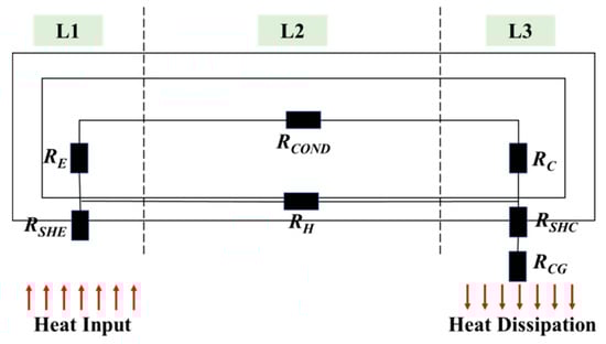 As the numerical simulation of a heat pipe is usually time-consuming and complex in terms of the calculations due to the complicated heat transfer mechanism, a simplified equivalent thermal resistance network model of a tubular heat pipe with a high accuracy is established to access the thermal performance of the heat pipe [29,30]. By analyzing the working principle of the heat pipe, we can see that the equivalent thermal resistance of the heat pipe can be divided into seven parts, as shown in Figure 9. In the thermal model, at the evaporator section, the thermal resistance from the shell wall to the vapor chamber can be divided into four parts: (1) the thermal conduction resistance RSHE of the shell wall; (2) the thermal conduction resistance RGR of the grove structure; (3) the thermal conduction resistance RSP of the supporting column; and (4) the thermal resistance RE due to the phase change in the evaporation process. The heat transfer process at the condenser section is similar to the process at evaporator section.