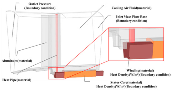 In this section, we describe a CFD model that was employed to evaluate the thermal benefits of the CGVHP for the electrical machine in the EDF. The commercial software ANSYS-Fluent was used here. The CFD model and main boundary conditions are depicted in Figure 10. In the method used here, both the solid and fluid domains are modeled to calculate the convection heat transfer between the solid and fluids parts. Due to the symmetry in the circumferential direction, only one-twelfth of the stator is modeled, which reduces the computation costs.