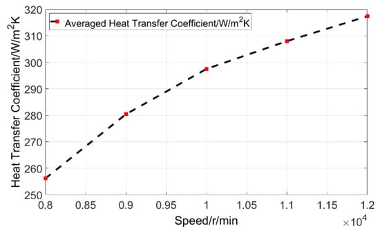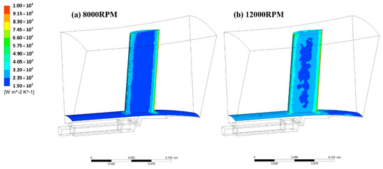 Figure 13 shows the relevant heat transfer coefficient distribution at speeds of 8000 r/min and 12,000 r/min. It shows that the heat transfer coefficient of the convection process is greatly improved by the increased air velocity. The area with a higher heat transfer coefficient is expanded along the leading edge and trailing edge of the cooling guide vane, as shown in Figure 12. The averaged heat transfer coefficient of the cooling guide vane is increased from 256.2 W/m2K to 317.4 W/m2K with the speed increasing from 8000 to 12,000 r/min, as shown in Figure 14.