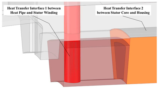 To account for the heat flux and heat exchange rate in different heat conductive path due to the different thermal conductivity of the heat pipe, two heat transfer interfaces are incorporated into the model, as shown in Figure 15. The first interface is the contact area between the heat pipe and the end winding coil, while the second interface is between the stator core and the stator housing. The heat generated in the stator core and winding is dissipated through these two heat transfer interfaces. The corresponding surface area of heat transfer interface 1 and heat transfer interface 2, used for exchanging heat, are 148.33 mm2 and 1321.8 mm2, respectively. These areas are used to calculate the heat transfer capacities of the two heat interfaces in the subsequent analysis.