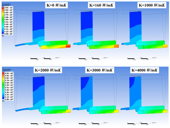 The maximum temperature in the stator winding under different degrees of thermal conductivity of the heat pipe is shown in Figure 16. MaxWindingTemperature12 represents the maximum winding temperature under the thermal load of the corresponding fan rotation speed of 12,000 r/min, while MaxWindingTemperature8 represents that of 8000 r/min. It shows that the maximum temperature of the winding significantly decreases with the increase in the heat pipe’s thermal conductivity. The maximum temperature of the winding under the fan rotation speed of 12,000 r/min is reduced from 133.7 ℃ to 108.2 °C with the thermal conductivity of the heat pipe increasing from 0 to 4000 W/mK, and a reduction of nearly 25.5 °C is achieved. This reduction in the maximum winding temperature is caused by the lower thermal resistance which is created by the heat pipe between the end winding and the cooling guide vane. However, the maximum temperature of the winding under a fan rotation speed of 8000 r/min is much lower than that of 12,000 r/min, mainly due to the much lower copper loss, as shown in Figure 12. The respective temperature distribution in the stator part with the cooling guide vane of the heat pipe at the fan rotation speed of 12,000 r/min under different thermal conductivities is shown in Figure 17. It is also worth noting that with the increased thermal conductivity of the heat pipe, the higher temperature zone is expanded from the hub to the tip of the cooling guide vane, resulting in an increased temperature difference between the cooling guide vane and the cooling air flow. The increased temperature difference is also beneficial for enhancing the convection capability.