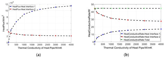 The lower thermal resistance between the end winding and the cooling guide vane also influences the heat flux distribution in the different heat conductive paths. This is indicated in Figure 18a. The heat flux in heat transfer interface 1 increases from 0 W/m2 to a maximum of 115,000 W/m2 when the thermal conductivity of the heat pipe increases from 0 to 4000 W/mK. Meanwhile, the heat flux in heat transfer interface 2 decreases from 33,660 W/m2 to 20,794 W/m2. The corresponding heat transfer capacities through the heat transfer interfaces are shown in Figure 18b. Clearly, it can be seen that more than 17 W of heat is transmit to the cooling guide vane by the heat pipe when the thermal conductivity of the heat pipe is increased to 4000 W/mK. Meanwhile, the heat dissipated through the stator and housing is reduced from 44 W to 27 W. The total heat transfer capacity through the two heat transfer interfaces remains unchanged.
