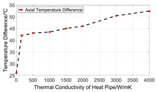 As more heat is dissipated in the stator winding through the heat pipe, the temperature in the end winding reduces significantly. In the proposed CGVHP, a single heat pipe is installed on one side of the end winding. The large temperature reduction in the end winding, which is due to the high thermal conductivity of the heat pipe, leads to an increase in the winding temperature difference in the axial direction. The temperature difference in the axial direction increases from 26 to 52.4 °C when the thermal conductivity of the heat pipe increases from 0 to 4000 W/mK, as shown in Figure 19. The axial winding temperature difference implies that the heat transfer of the winding in axial the direction is worthy of extensive study. The winding temperature could be further reduced if the equivalent axial thermal conductivity of the winding were to be improved.