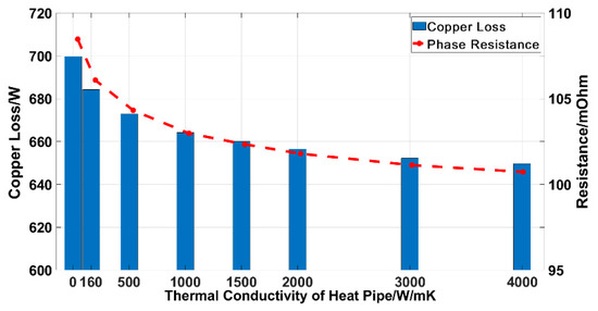 In terms of the electromagnetic benefits of the proposed CGVHP, one of the major benefits of the temperature reduction is the winding resistance, which is reduced simultaneously. As is known, the electrical resistance of a copper wire increases with the temperature increase. A lower winding temperature enables a lower electrical resistance. The phase change and copper loss change due to the winding temperature reduction, along with the thermal conductivity of the heat pipe, are shown in Figure 20. In the electrical machine under investigation, the phase resistance of the winding is decreased from 108.48 mOhm to 100.73 mOhm, with the winding temperature decreased by 25 °C, which means that a 7.14% reduction in the phase resistance is achieved. Consequently, this reduction in the phase resistance enables a 50 W corresponding reduction in the copper loss, which decreases from 699.72 W to 649.726 W, which further benefits the temperature reduction in the stator winding and improvement in the electrical machine’s efficiency.