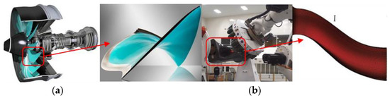 Advanced composite materials, composed of two or more substances, have been widely used in aerospace, automotive, and infrastructure fields, offering a synergistic performance [1]. Particularly, continuous carbon fiber reinforced composite shows enhanced mechanical properties while remaining lightweight. This type of material provides a great possibility for replacing traditional materials to some extent, such as steel, with advanced performance, which promotes the composite manufacturing techniques for its quality [2]. Currently, AFP is one of major automation technologies for manufacturing composite components [3,4]. An AFP machine includes a computer-controlled moving platform with an AFP head that governs the delivery of each prepreg fiber strap from creels to a mold. Since AFP heads are able to control the movement of each fiber slit, it fits better for structures with high complexity-shaped surfaces which need to be produced consistently and efficiently, such as engine blades and S-shaped inlets (as seen in Figure 1). During this process, straps are dragged from creels and then fed through a delivery system into an AFP head, where straps are arranged side-by-side and compacted onto a mold surface with consistent compaction force and consolidation temperature by a compaction mechanism [5]. The compaction process influences the interlayer and/or intra-layer adhesion and defects, and it has been proven that compaction mechanisms play a significant role in composite material manufacturing [6,7].
