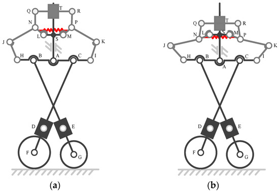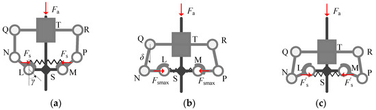 To achieve the stiffness transformation, the symmetrical bistable structure is designed to be attached to the translational joint S of the compaction mechanism. The bistable structure includes a translational joint T and six rotational joints. In the compliant state, the rotational degree of freedom (DOF) in joints L and M is restricted by a geometric limit and a preloaded spring NP, which is at a stable position, as shown in Figure 1a. The actuation force is at translational joint T following the axis TA. The transformation occurs as the actuation force exceeds a certain threshold and the restraint of joints L and M will be gradually released. Consequently, the type of the variable kinematic joints J and K is changed from a rotational pair to fixed pair. When combined with the force of spring NP, the bistable structure is at a second stable position, as shown in Figure 2b.