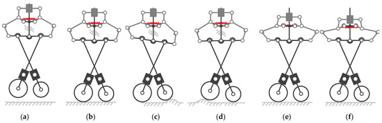 With the intention of generating a conceptual design, we investigated underactuated mechanism design to understand the working principle of configuration adaptation. As a means of adjusting stiffness, variable kinematic joints are designed using geometric limits and/or constrained forces [32]. This type of joint is essential to achieving the expected movement for metamorphic mechanisms. Special focus is given to the compaction movement and limited space, so that linear actuation, such as a linear motor and pneumatic cylinder, is selected. The basic schematic solutions are formed by the above findings and then redesigned for an underactuated compaction mechanism with an implemented adjustable posture, as shown in Figure 2.
