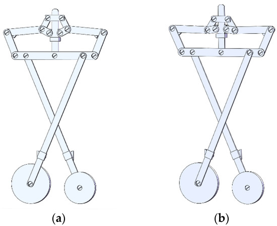 Schematic diagram of compaction segments conforming arbitrary surfaces with different longitudinal displacements, illustrating the lifting angles to , link lengths , , , and , longitudinal displacement and and other geometric information; (a) and (b) show the compacting process corresponding to Figure 4d,c, respectively.