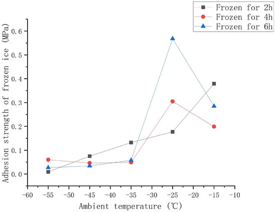 As can be seen from Figure 5, as the ambient temperature drops (−15 C∼−55 C ), the freezing adhesion strength of aluminum alloy first increases and then decreases, and the peak is about −25 C. The results are consistent with the results of the ice adhesion strength test designed by Ding Liang [] (0.051 MPa∼0.255 MPa at −13 C) and the test trend of Zhang, Y.J. [] that the shear strength of fresh water first increases and then decreases with the ambient temperature decrease. Therefore, the test data are relatively reliable. In this test, the frozen ice was artificially generated by the dripping method, and the shear adhesion strength of the ice was measured by the tensile shear method. The high and low temperature alternating damp-heat test chamber was used to create environmental conditions for the specimens, and the tensile failure was carried out by the electronic universal testing machine. The experimental results show that the mean adhesion strength of the frozen ice ranges from 0.009 MPa to 0.568 MPa when the ambient temperature is −55 C to −15 C for 2 h to 6 h and the adhesion surface roughness of aluminum alloy is up to 1.6 microns, and the maximum value of ice adhesion strength test ranges from 0.010 MPa to 0.672 MPa.