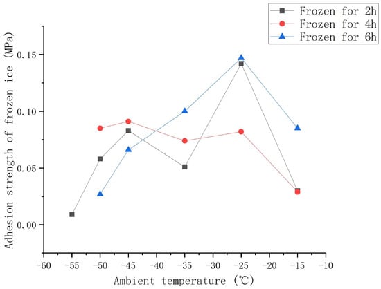 From the test data in Table 5 and Table 6 to Equation (1), the adhesion strength value of the frozen ice under different working conditions is shown in Table 7 and Table 8, and the trend of the adhesion strength of the frozen ice is shown from Figure 5, Figure 6 and Figure 7.