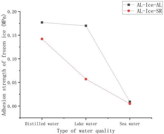 As can be seen from Figure 7, the icing adhesion strength of aluminum alloy or silicone rubber is affected by water quality. It has the largest icing adhesion strength of distilled water, followed by lake water and the smallest sea water. At the same temperature, the adhesion strength of lake ice is 78.41% of distilled water ice and seawater ice is 4.55% of distilled water ice. The adsorption of impurity or salt on the grain surface on frozen ice nucleation may cause such test phenomenon.