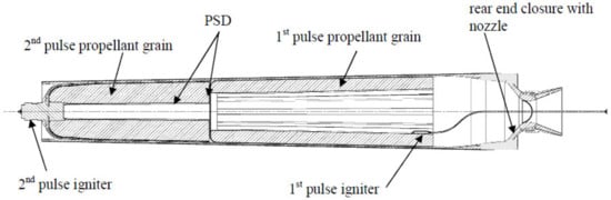 The double-pulse solid rocket motor (SRM) consists of two combustion chambers. Two combustion chambers, which share the same nozzle, are connected by a pulse separation device (PSD). The interval time between the two pulses can be adjusted according to tactical indicators. Compared with the traditional SRM, the double pulse SRM has the advantages of multiple times ignition, discontinuous thrust, and controllable energy of the propulsion system. It is an advanced power device in the existing flight system. The PSD is one of the key components of the double-pulse SRM, and many researchers have carried out comprehensive and systematic research on different types of PSD. Wang CG [1,2,3,4], Stadler [5,6], Sun N [7], Wang CH [8], and Schilling S [9] deeply studied the PSD of metal diaphragm type, soft barrier type, plug type, and ceramic hatch cover type, respectively, and verified their working characteristics experimentally. Among them, the soft-type PSD of double-pulse SRM mainly plays the role of flame retardant and heat insulation and does not bear the force from the high pressure of fuel gas. Its structure is relatively light, which is beneficial to improve the mass ratio of the motor. The structure of the double-pulse SRM with the soft-type PSD diagram is shown in Figure 1.