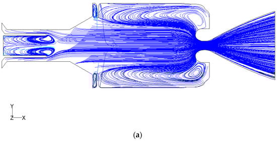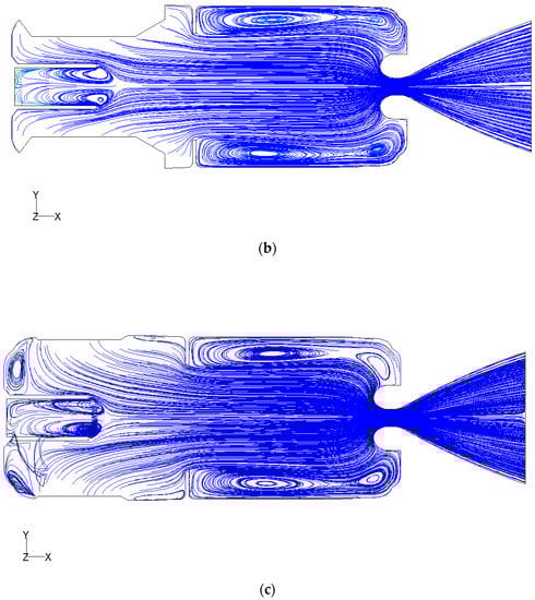 The full hexahedral structure grid is meshed in the calculation with the size of 5 mm × 5 mm × 5 mm, as shown in Figure 3. The grid at the wall is densified. The grid at the nozzle grows proportionally and becomes sparser as it gets closer to the nozzle outlet. The grid transition between different partitions is smooth, the axial and radial grid lines are orthogonal, and the grid in the entire computational domain has a high quality. The grid numbers of the three models are about 320 thousand, 470 thousand, and 660 thousand, respectively.