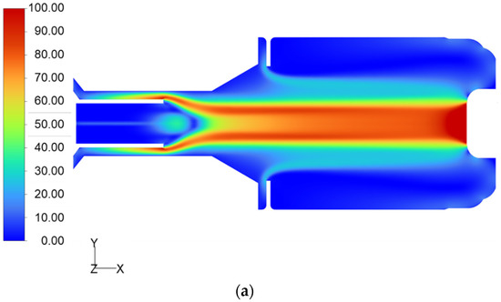 The influence degree of particle phase on ablation is analyzed through the contour of the particle concentration at different times, as shown in Figure 4. The results show that, at different times of the II pulse motor working process, most of the Al2O3 particles converge in the center and then flow out of the nozzle along the center line due to the obstruction of the axial PSD to the gas flow. The accumulation of particles in the I pulse combustion chamber is very small, so there is no collision of large-scale condensed particles with the wall of the I pulse combustion chamber and the wall of the rear head. Therefore, the particle phase is not the main factor of the ablation in the I pulse insulation layer.